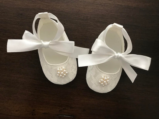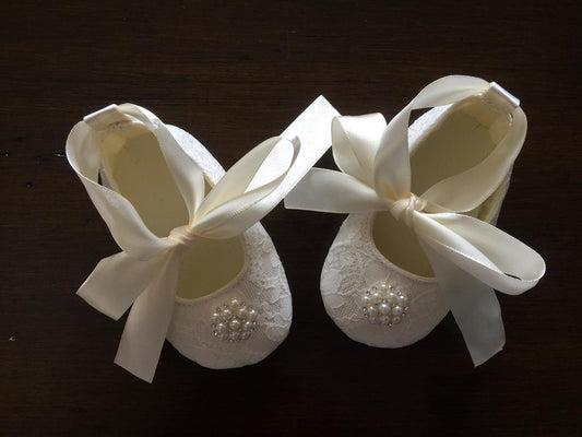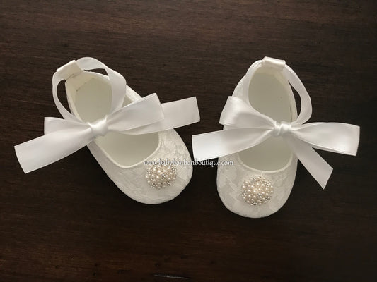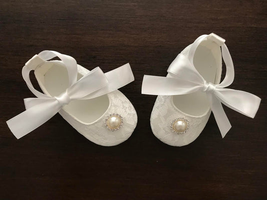 Baby Girl Ivory Lace Baptism Shoes, Pearls & Rhinestones