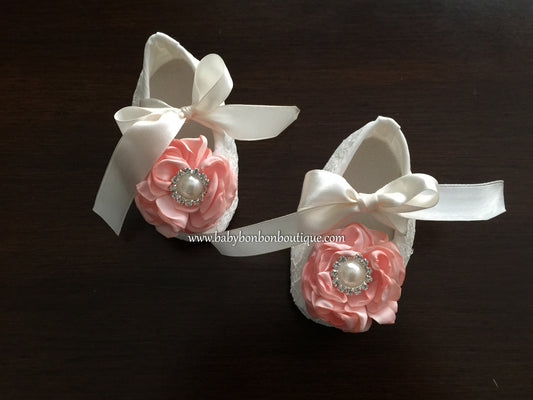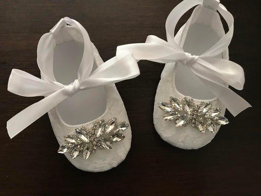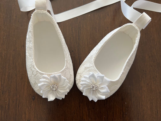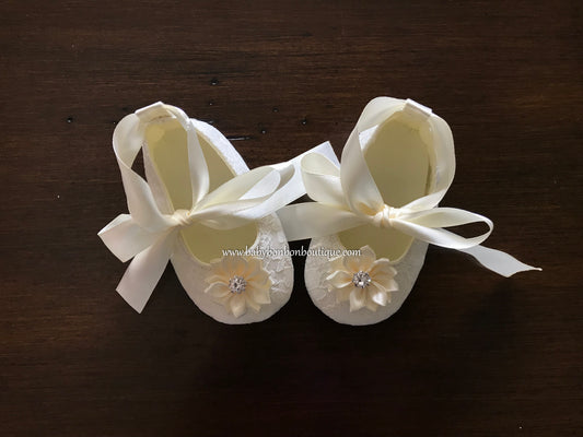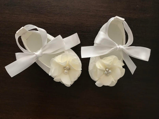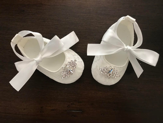 Ivory Lace Baptism Crib Shoes, Flowers & Rhinestones