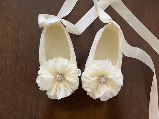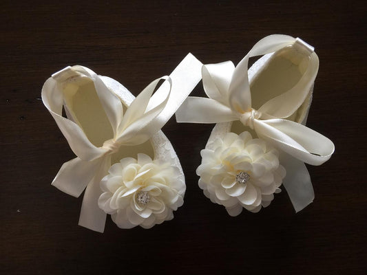 Ivory Baptism Shoes for Baby Girls with Ivory Flowers and Rhinestones