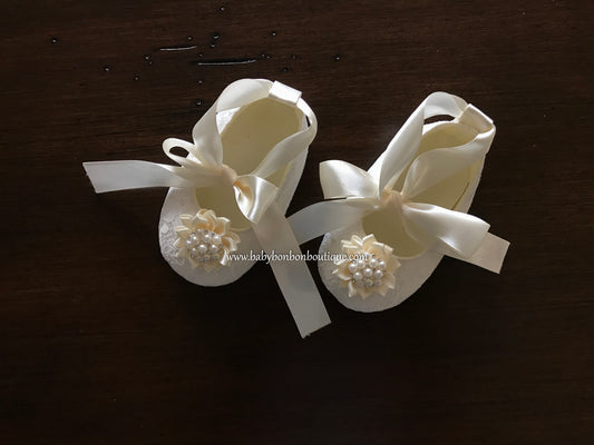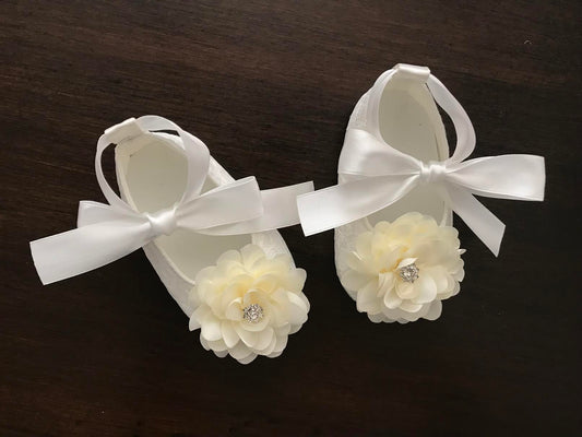 Ivory Baby Baptism Shoes with Flowers and Rhinestones