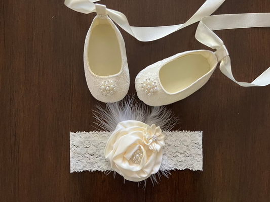 White Baptism Crib Shoes & Rhinestone Headband Set