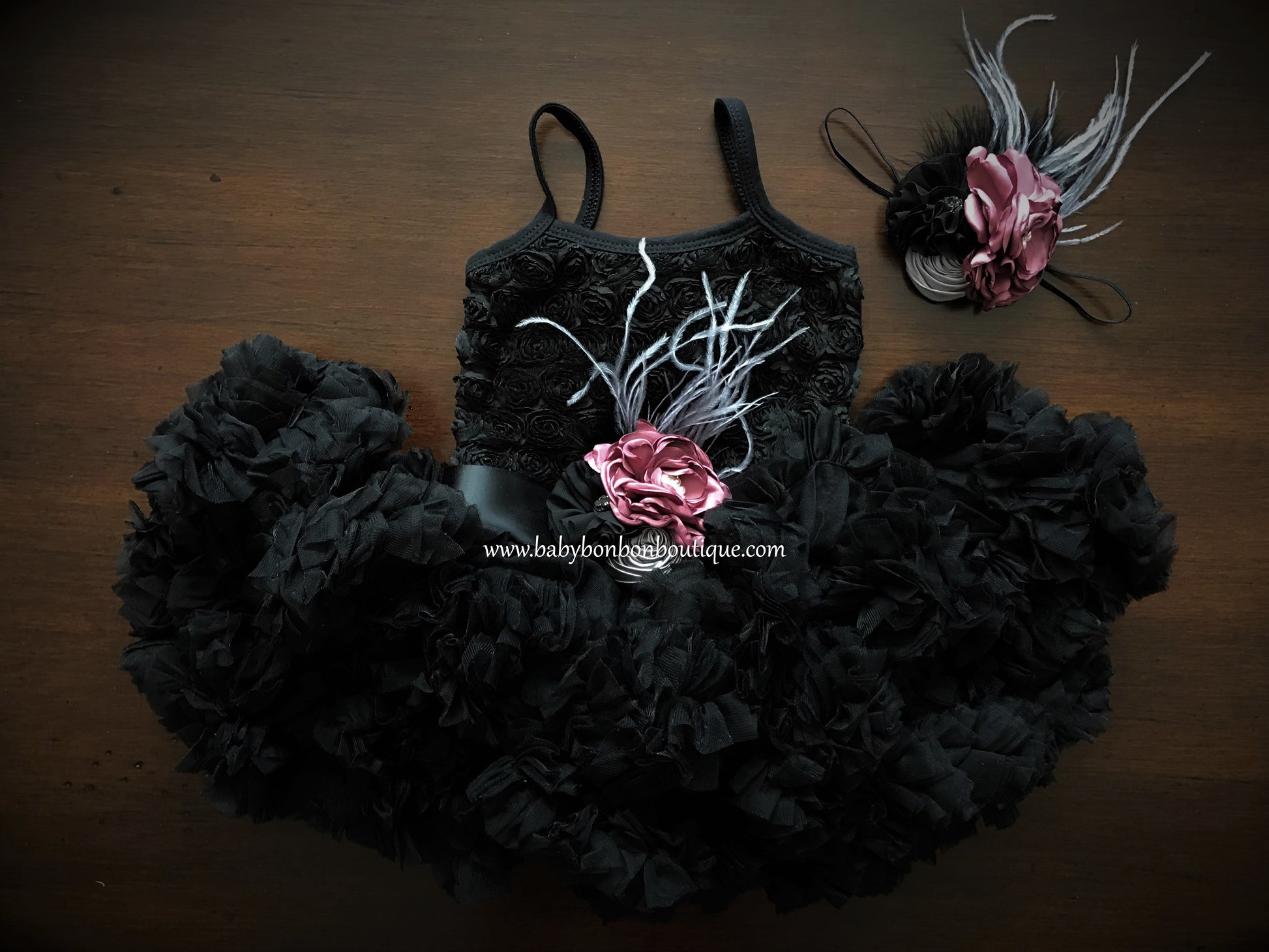 Baby Black Tutu Dress with Vintage Rose Headband and Sash