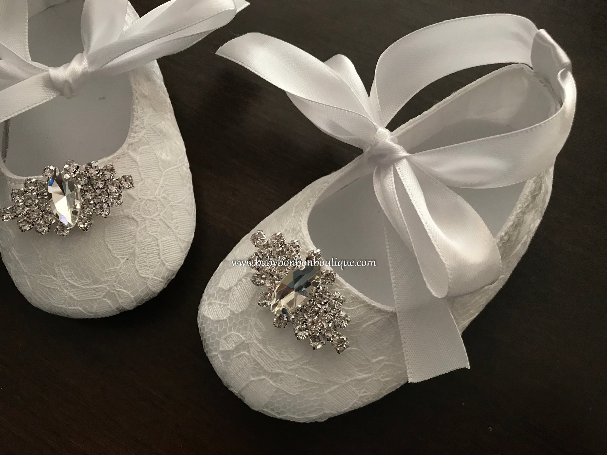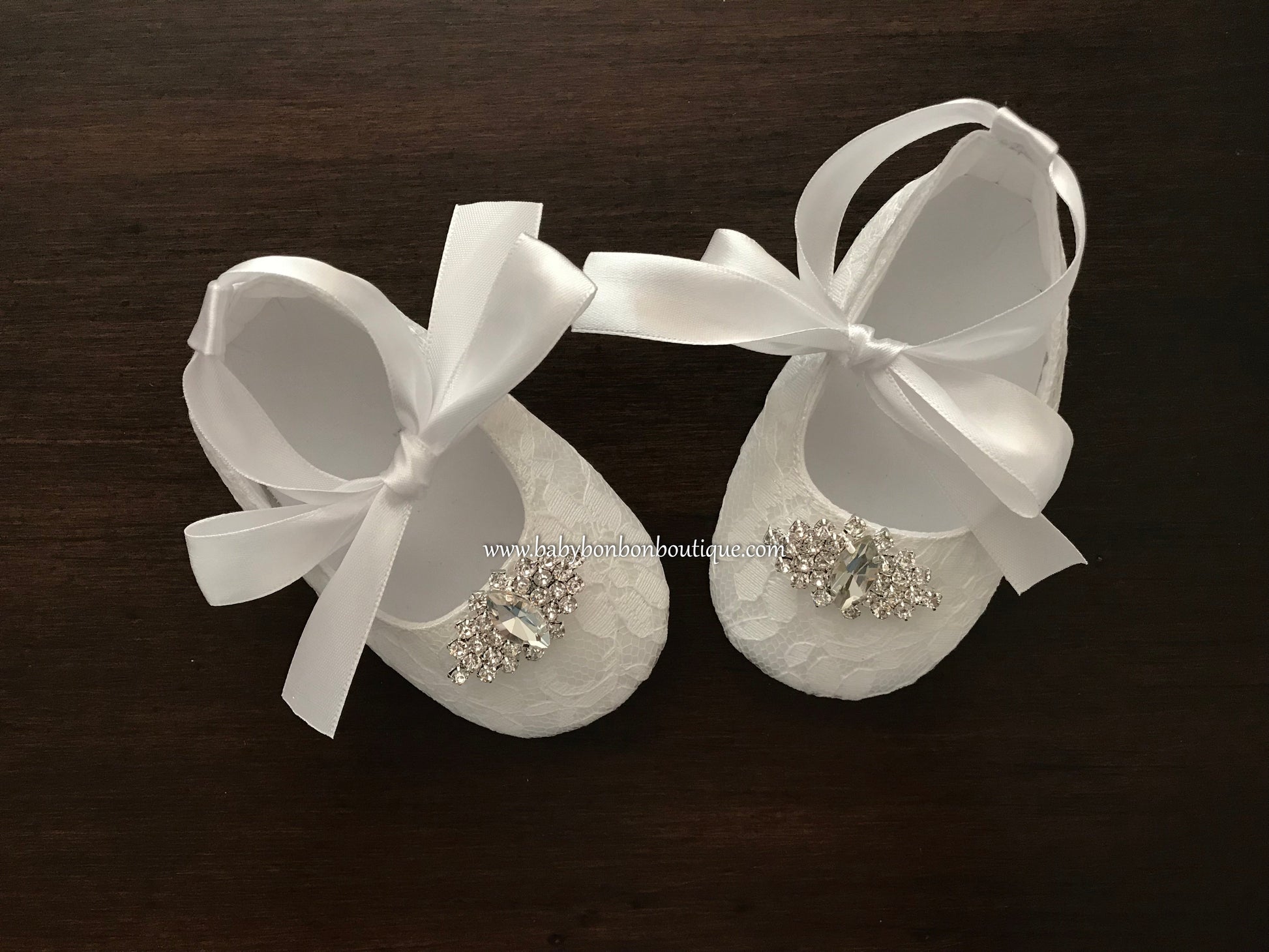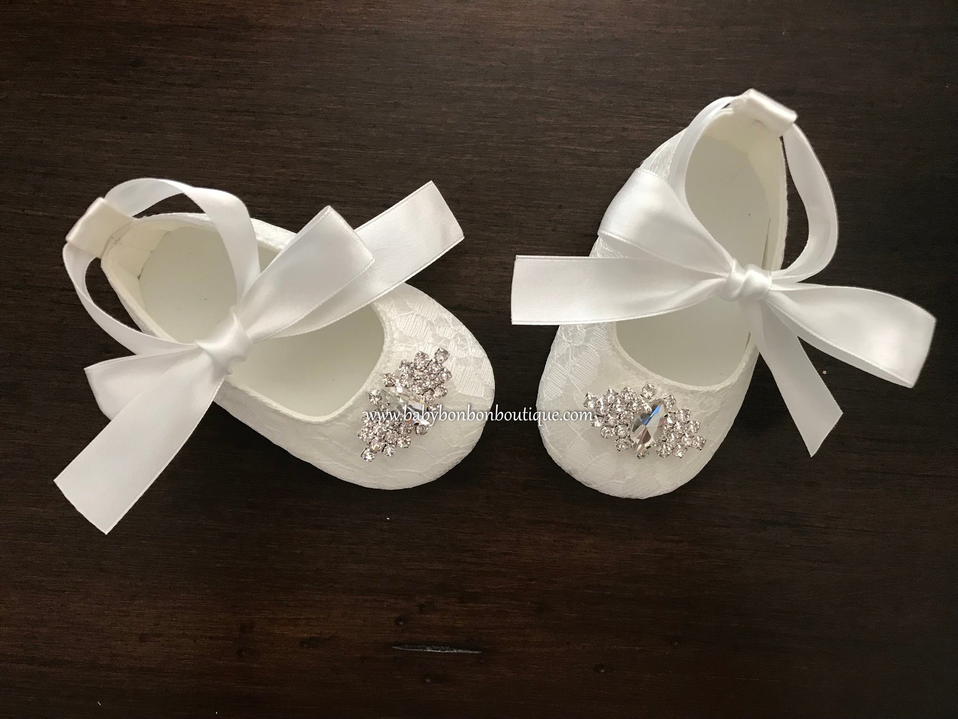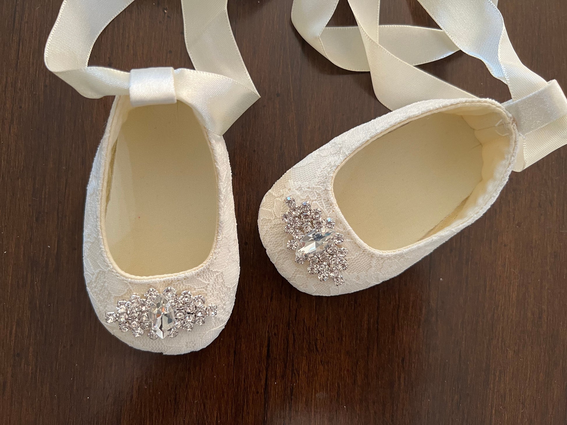 These pre-walking, soft sole baby girl baptism shoes are light and comfortable. They are made with beautiful lace in your choice of French Ivory, White, or French White color and adorned by stunning rhinestones. They are beautifully finished with pearl rhinestones. The satin ribbon completes the vintage design. They are perfect for baby baptism shoes, christening shoes and baby flower girl shoes.