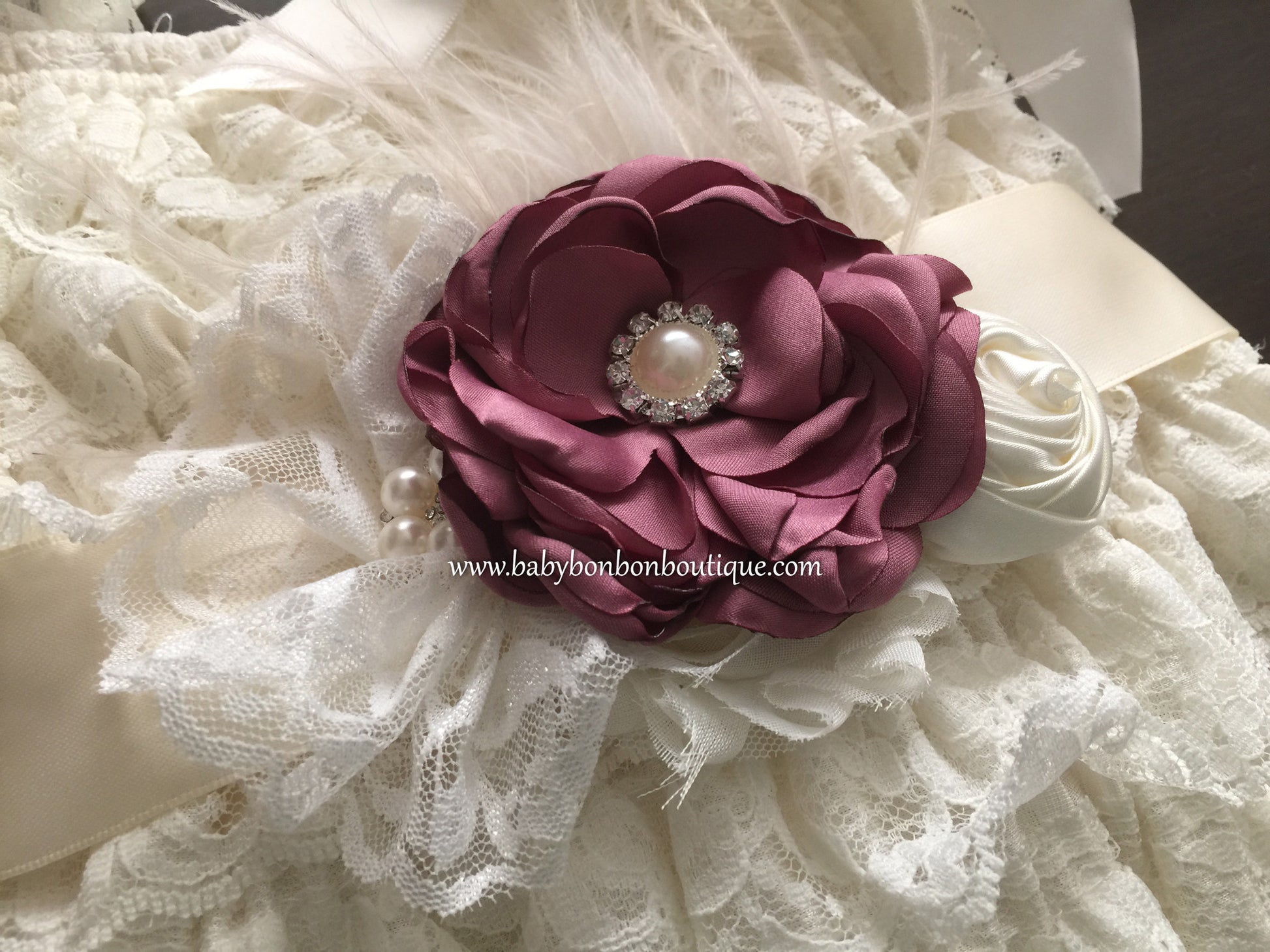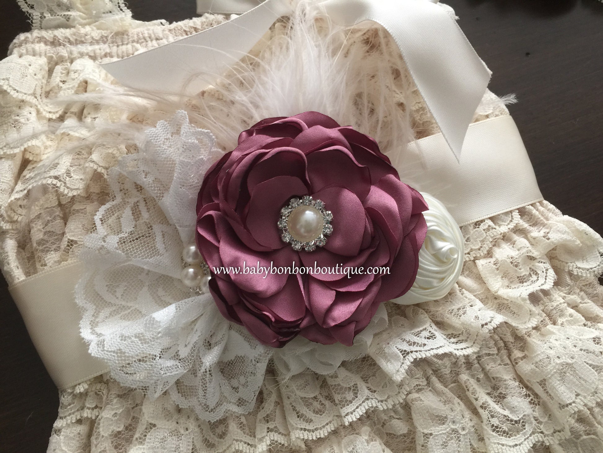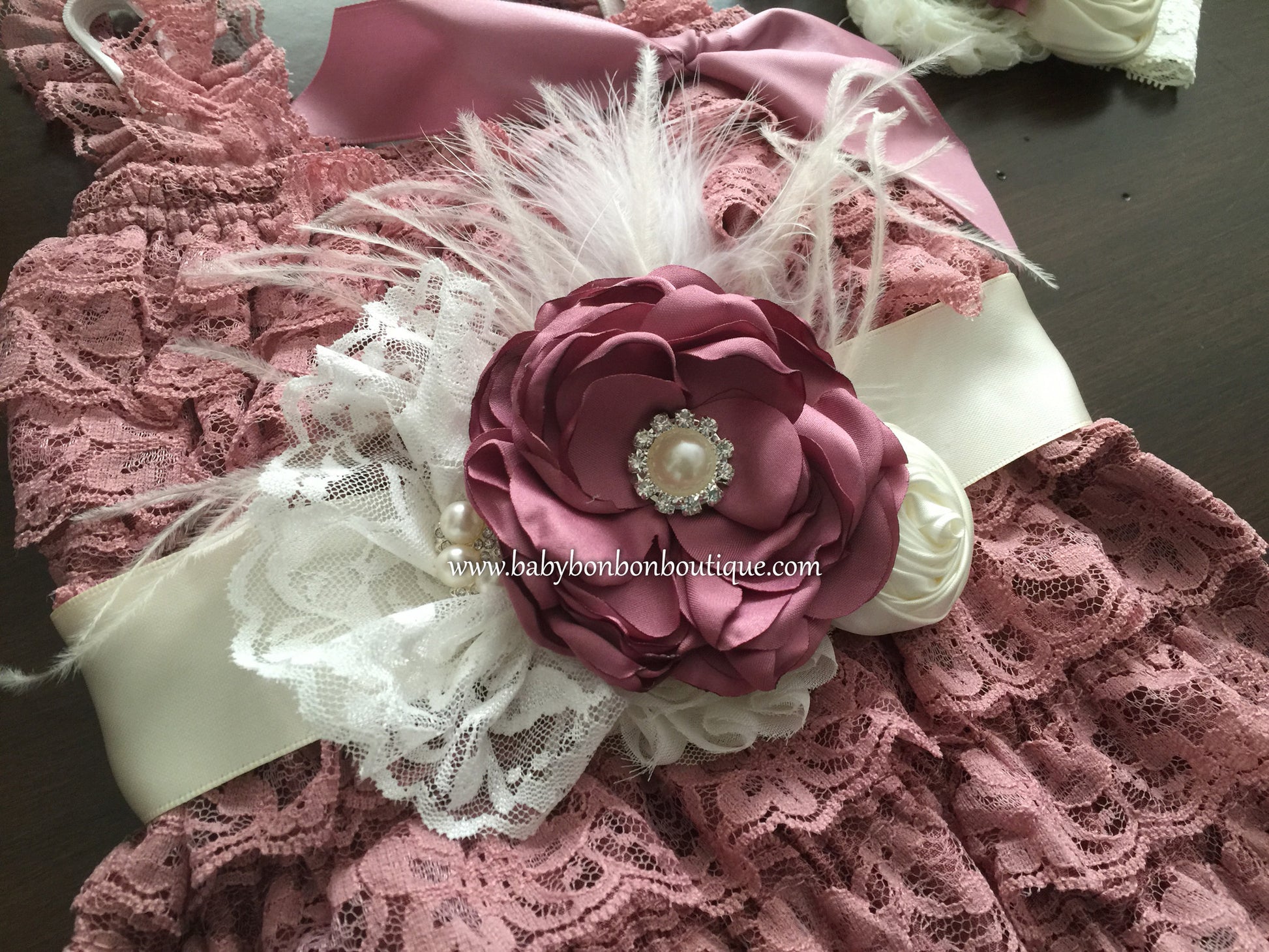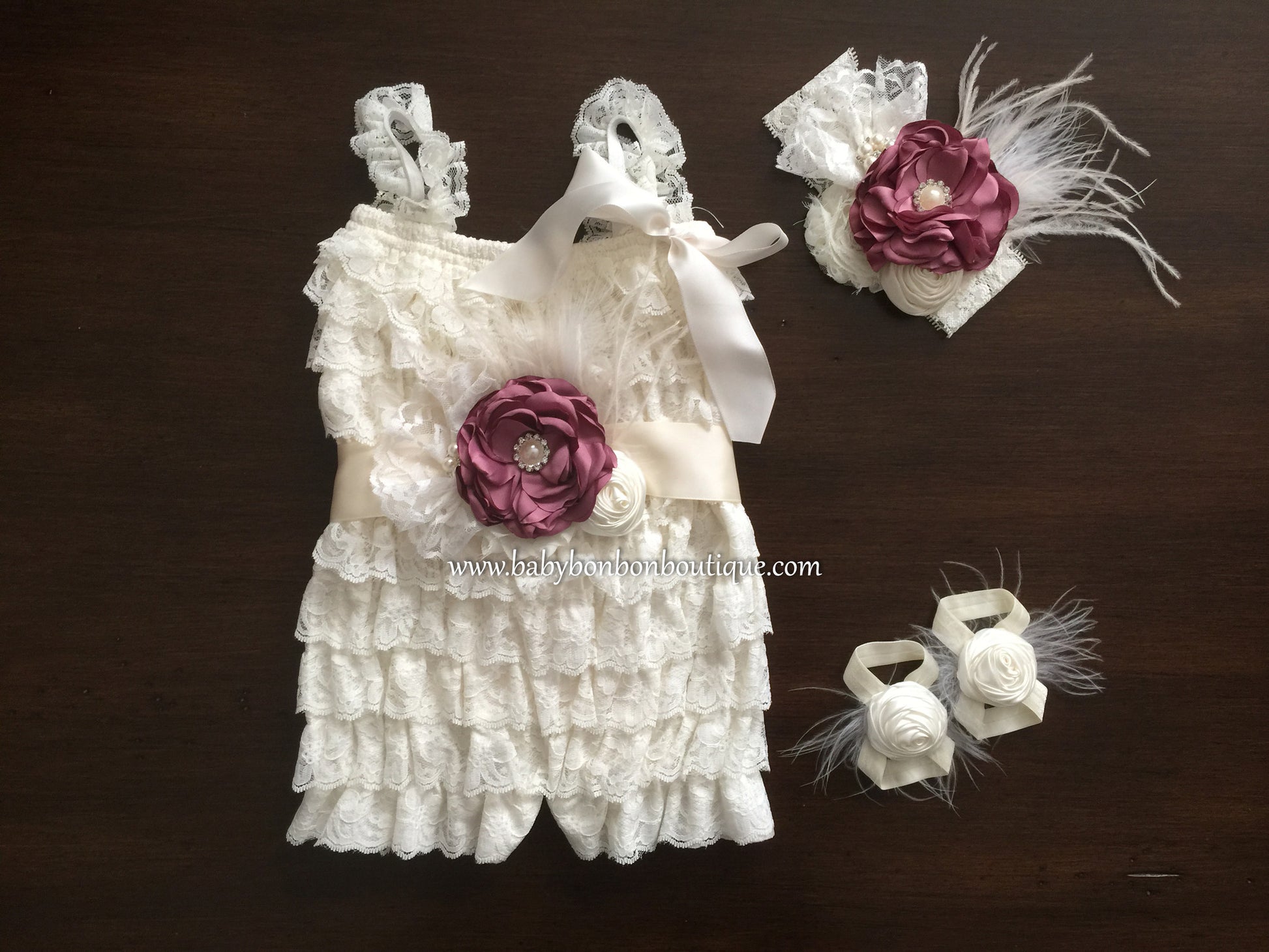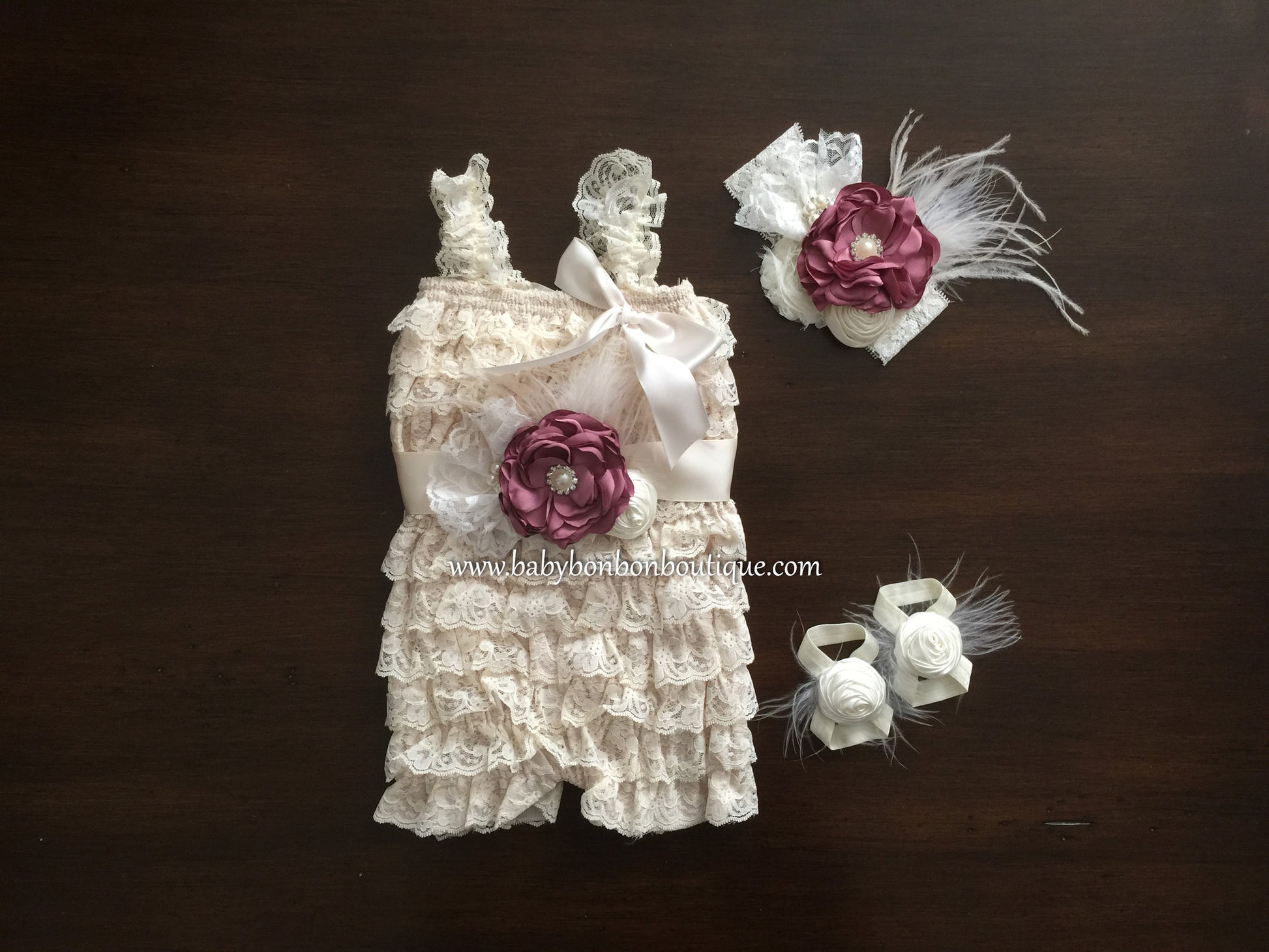 This adorable baby girl vintage style lace romper, headband, sash, and sandals set is a must have. For your baby's comfort, it is made with soft, beautiful lace, in your choice of Vintage Rose, French Ivory, or Rustic Beige color. The elastic and lace straps add much comfort and flexibility. Part of the French Vintage Headband Collection, this headband, sash, and barefoot sandals set is simply stunning. The set is made to order with beautiful burnt satin flowers in a chic Vintage Rose color and beautiful flowers in French Ivory, all sitting on a large French Ivory lace headband or Ivory satin ribbon, and embellished by beautiful white lace, white and vintage ivory feathers, pearls and rhinestones.