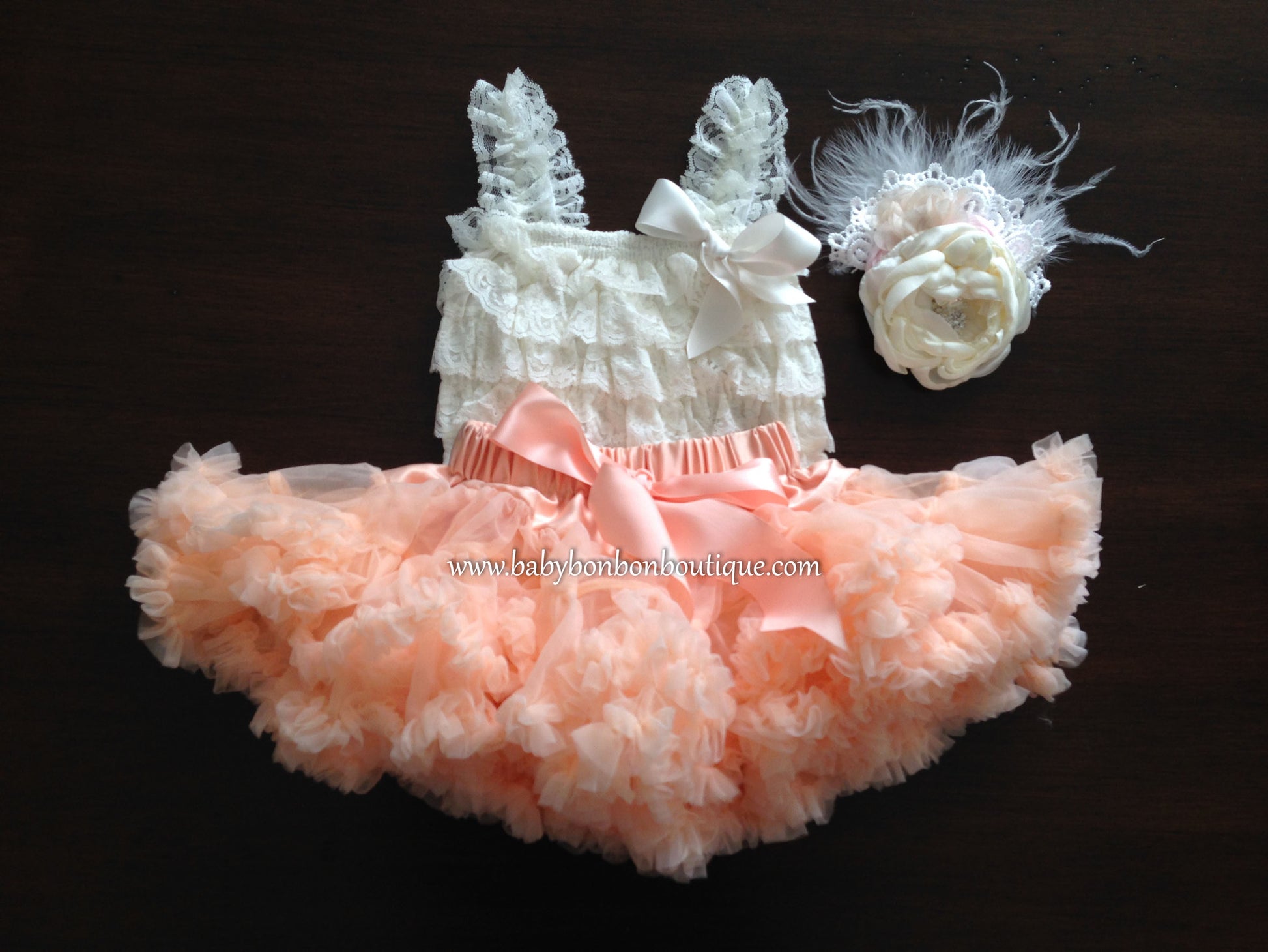 This baby girl vintage style, three outfits in one, French Ivory and Peach Blush trio is gorgeous. The Peach Petti Baby Skirt is super soft and fluffy. For your's baby comfort, it is made using soft chiffon and lace in a beautiful Peach color that is perfect for the summer. The elastic waistband allows for full comfort. The chic baby lace petti romper in a French Ivory color completes the style. It is made with soft lace. The elastic and lace straps add much comfort and flexibility. The headband is made to order with a beautiful ivory flowers, white lace, feathers, pearls, and rhinestones over Ivory lace. Your baby may wear this as a lovely set, and/or separately, making it the perfect birthday party dress, baby smash cake dress, baptism reception, christening reception, and baby photography.
