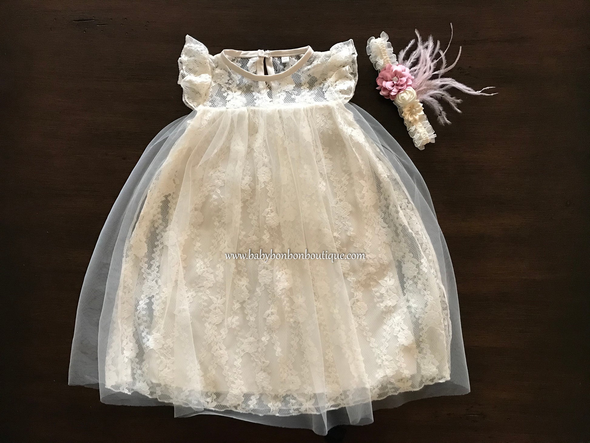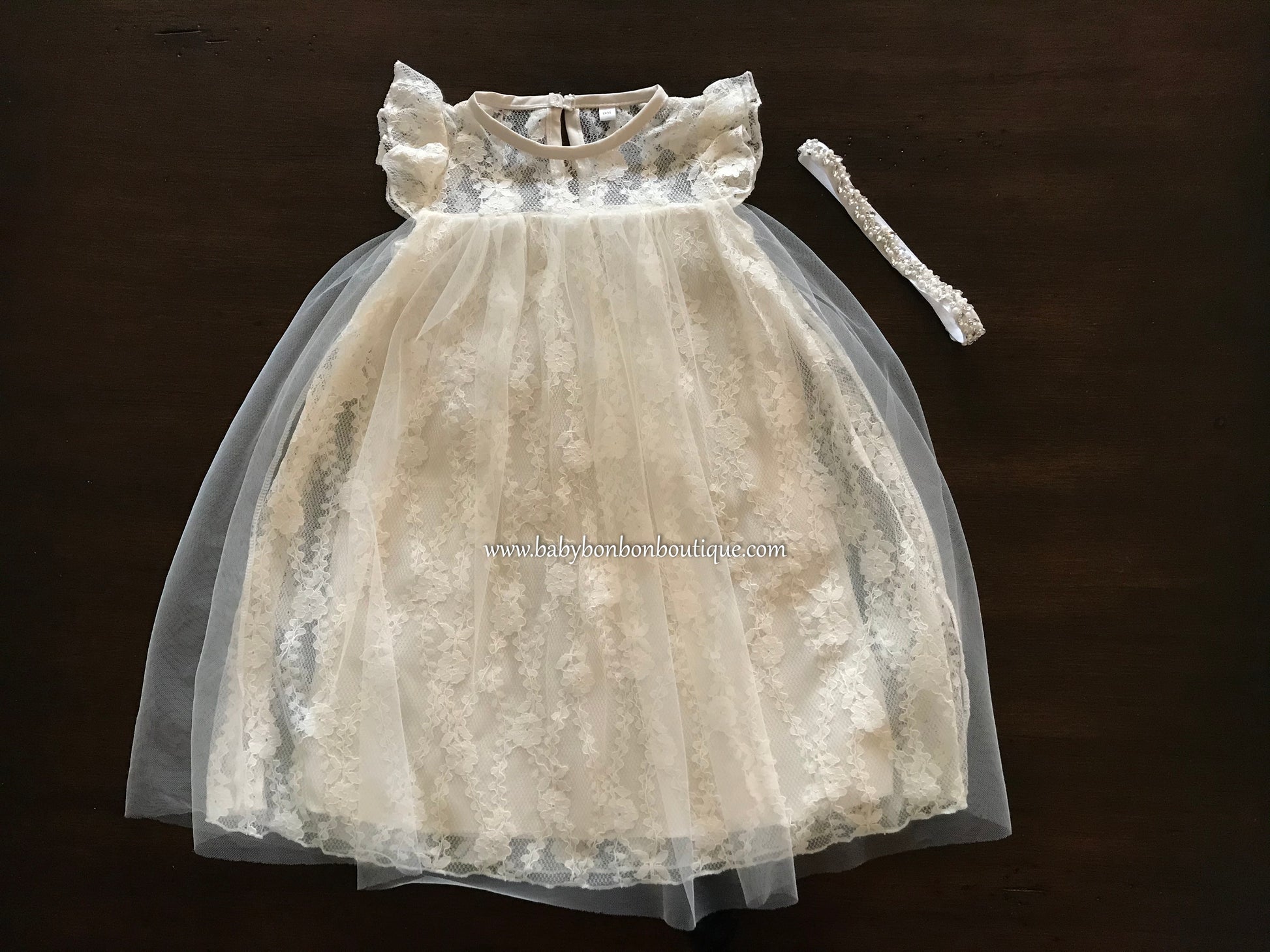 French Ivory Lace Christening Dress with Baptism Flower Headband. It is made using an exquisite lace in a stunning Vintage Cream color. It is fully lined. The butterfly fluttered sleeves add glamour, while completing the vintage design. The top soft tulle layer completes the beautiful vintage look. The matching baptism headband is handmade with your choice of flower colors. This set is perfect for baby girl baptism dress, baby girl christening dress, flower girl dress, and toddler girl party dress.