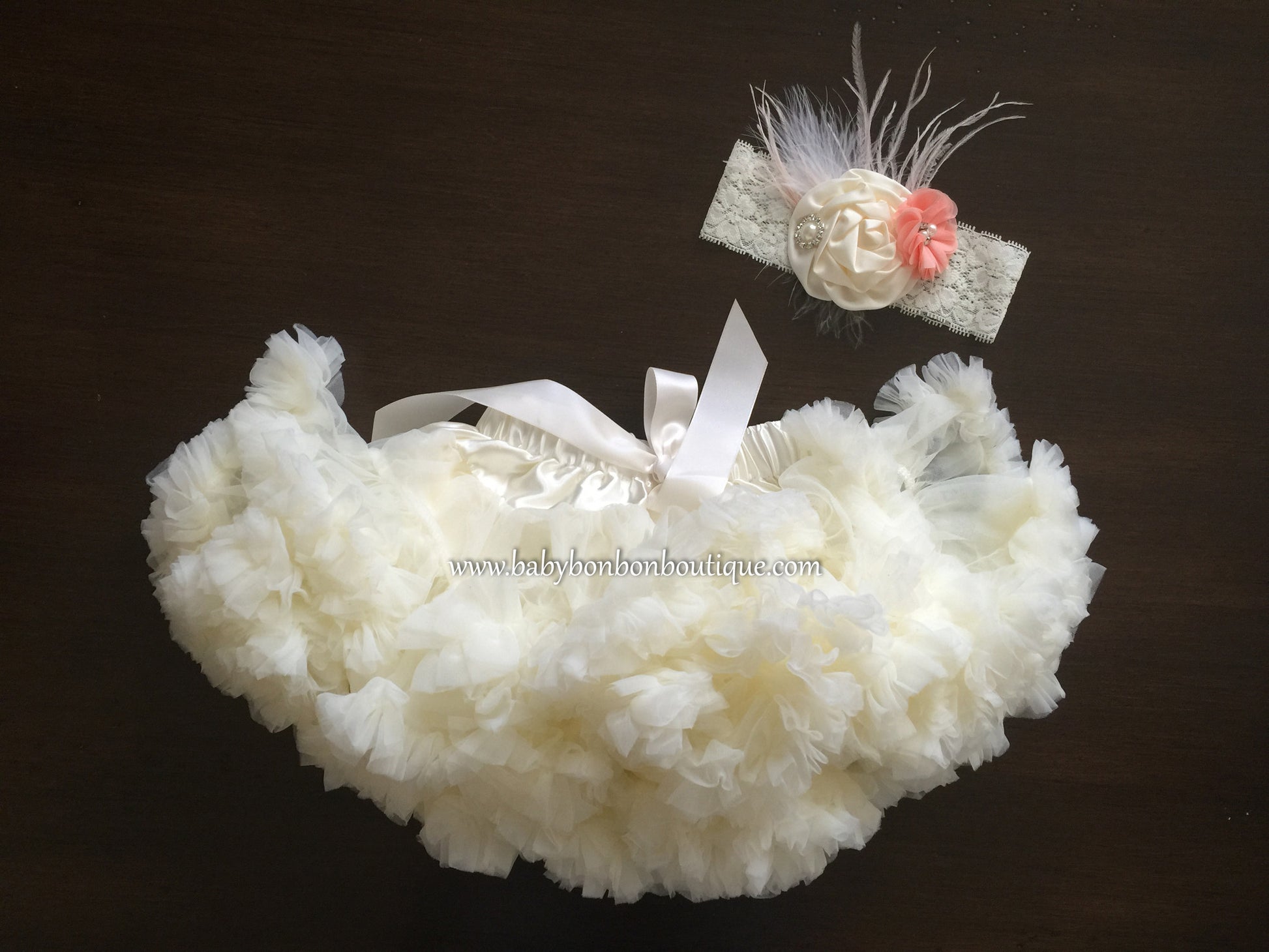 This French Ivory Baby Tutu Skirt is super fluffy and full of personality. It is made using soft chiffon and lace in an adorable French Ivory color that is perfect for the summer. The elastic waistband allows for full comfort. The vintage-style headband has beautiful petite flowers in ivory and peach. This fluffy petti skirt set is perfect for baby smash cake, baby photo prop, baby birthday, baptism reception, christening, and flower girl.