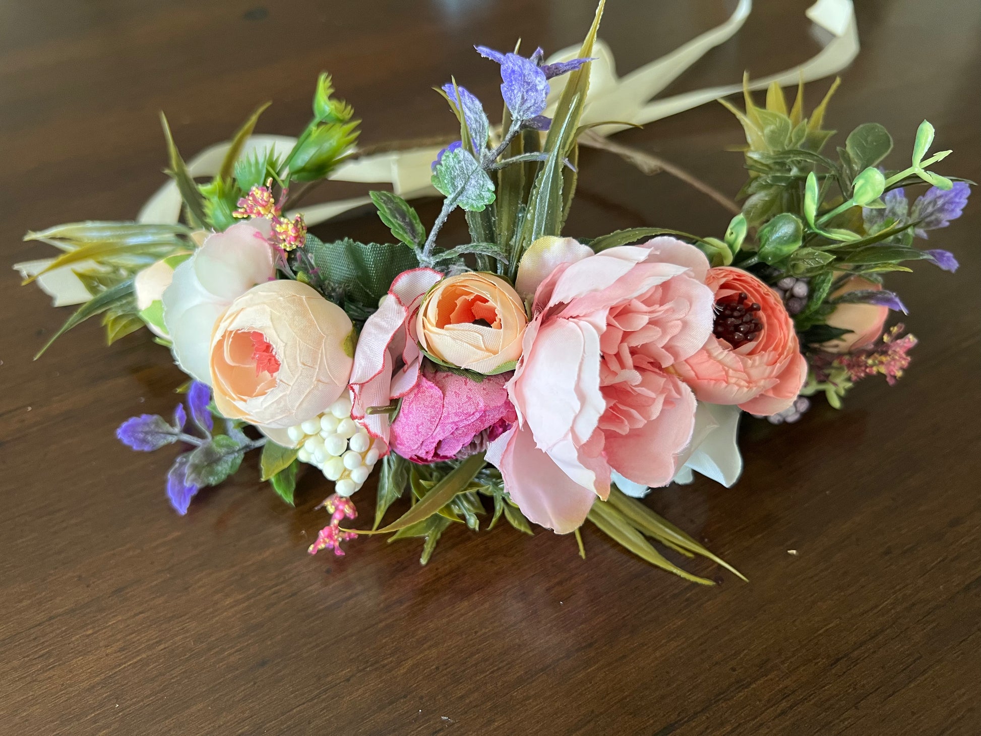 This beautiful French Creamy Pastels head wreath for baby girls is the perfect flower girl wreath, smash cake crown, birthday party flower crown, toddler wreath, baby photos crown, and more. It is made with an array of flowers in stunning, feminine colors.