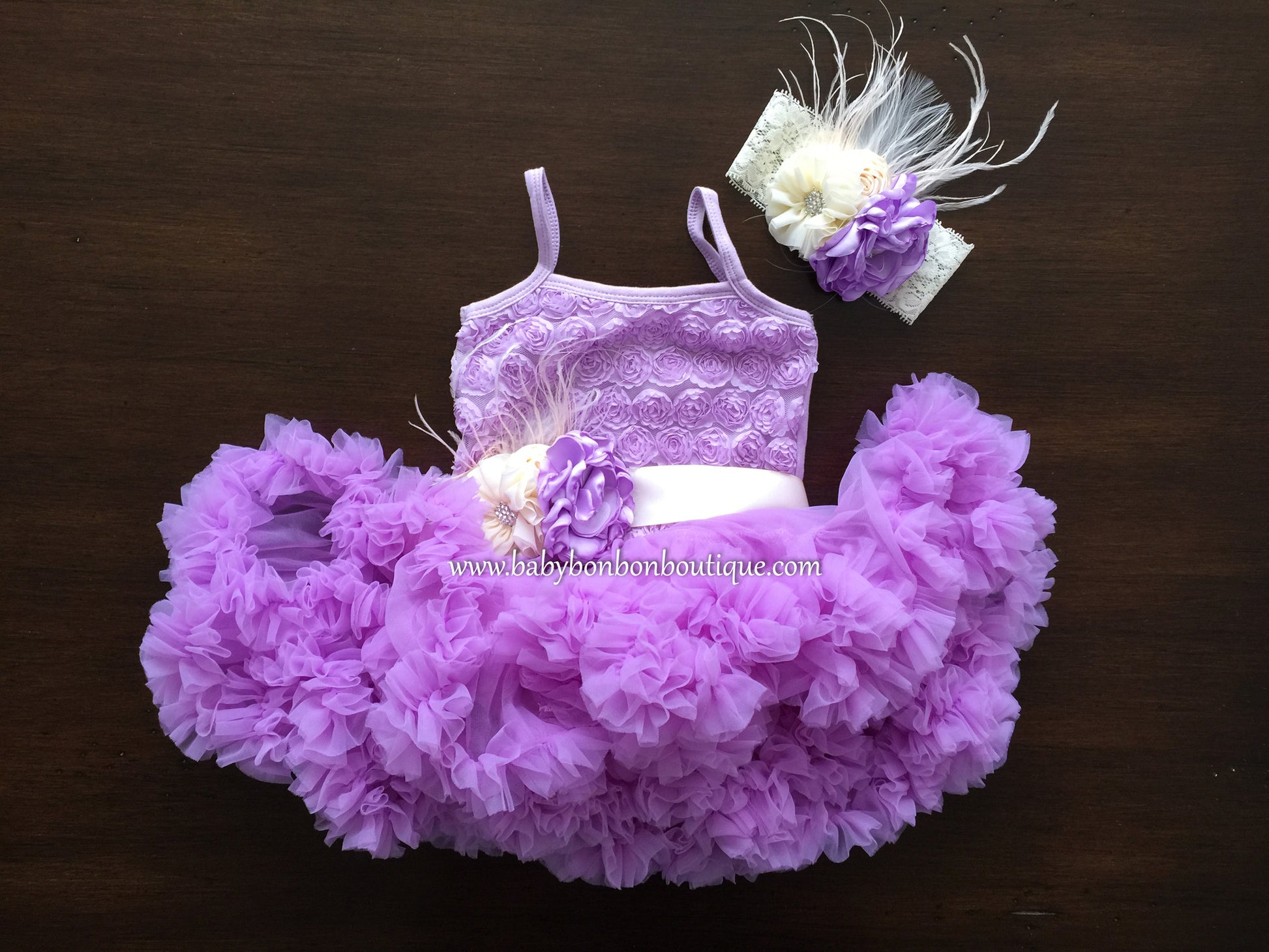 This beautiful Lavender Fluffy Tutu Dress is simply adorable. For your baby's comfort, it is made with soft fabrics in a Lavender color that is perfect for any occasion. It has multi-layered fabrics for super fluffiness. The delicate bust flower complete the French Vintage design. The headband and sash set is handmade with beautiful Lavender and Ivory flowers, embellished by pearls and rhinestones. This Lavender Fluffy Baby Dress, headband and sash set is perfect for baptism reception dress, flower girl dress, christening reception dress, smash cake dress, baby birthday dress, & baby photography dress.