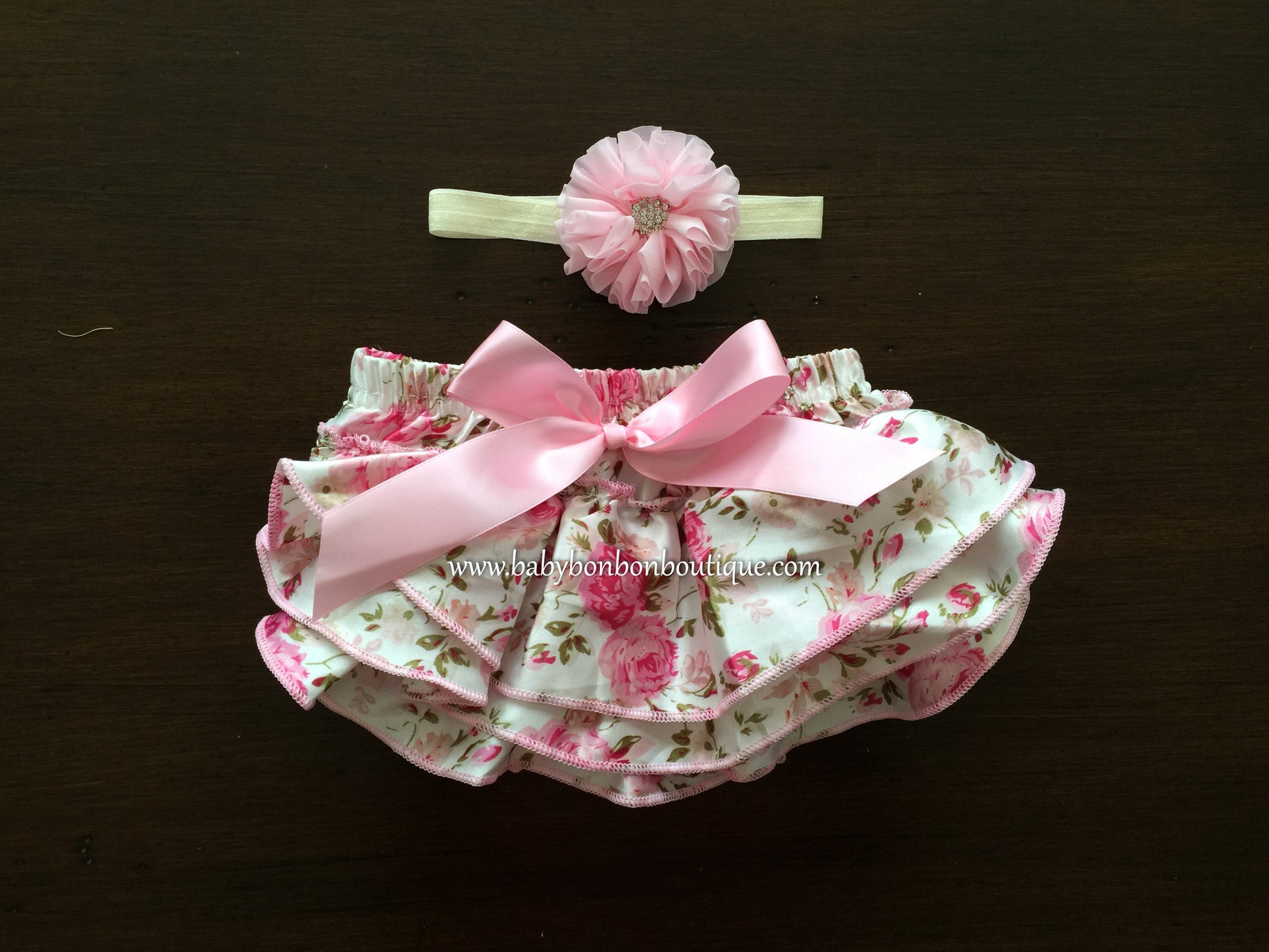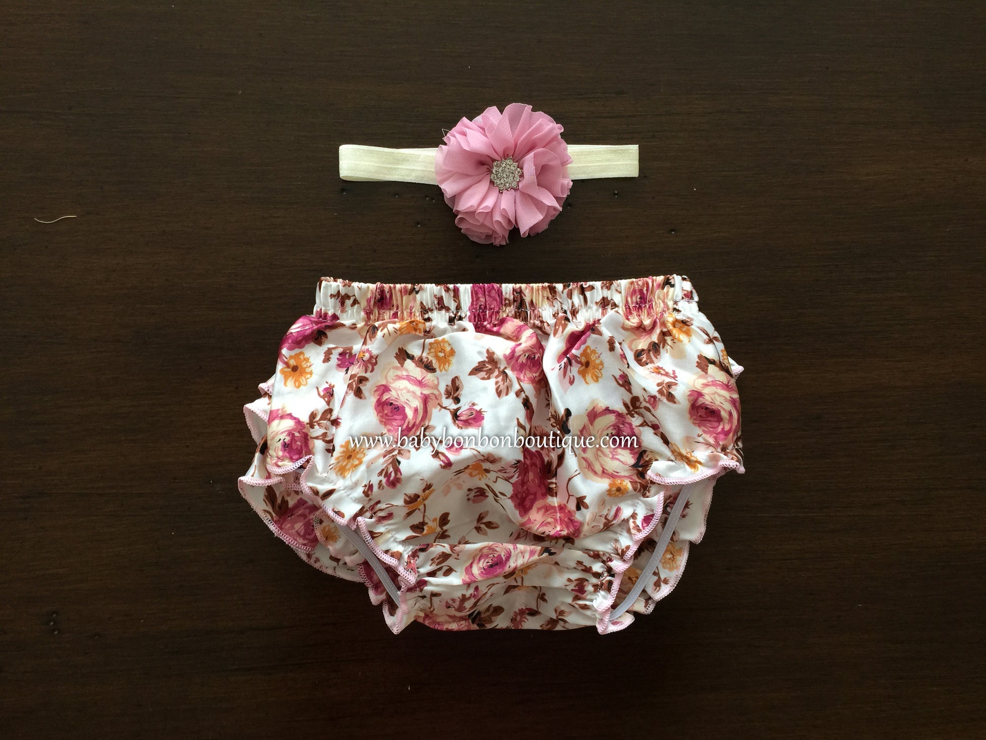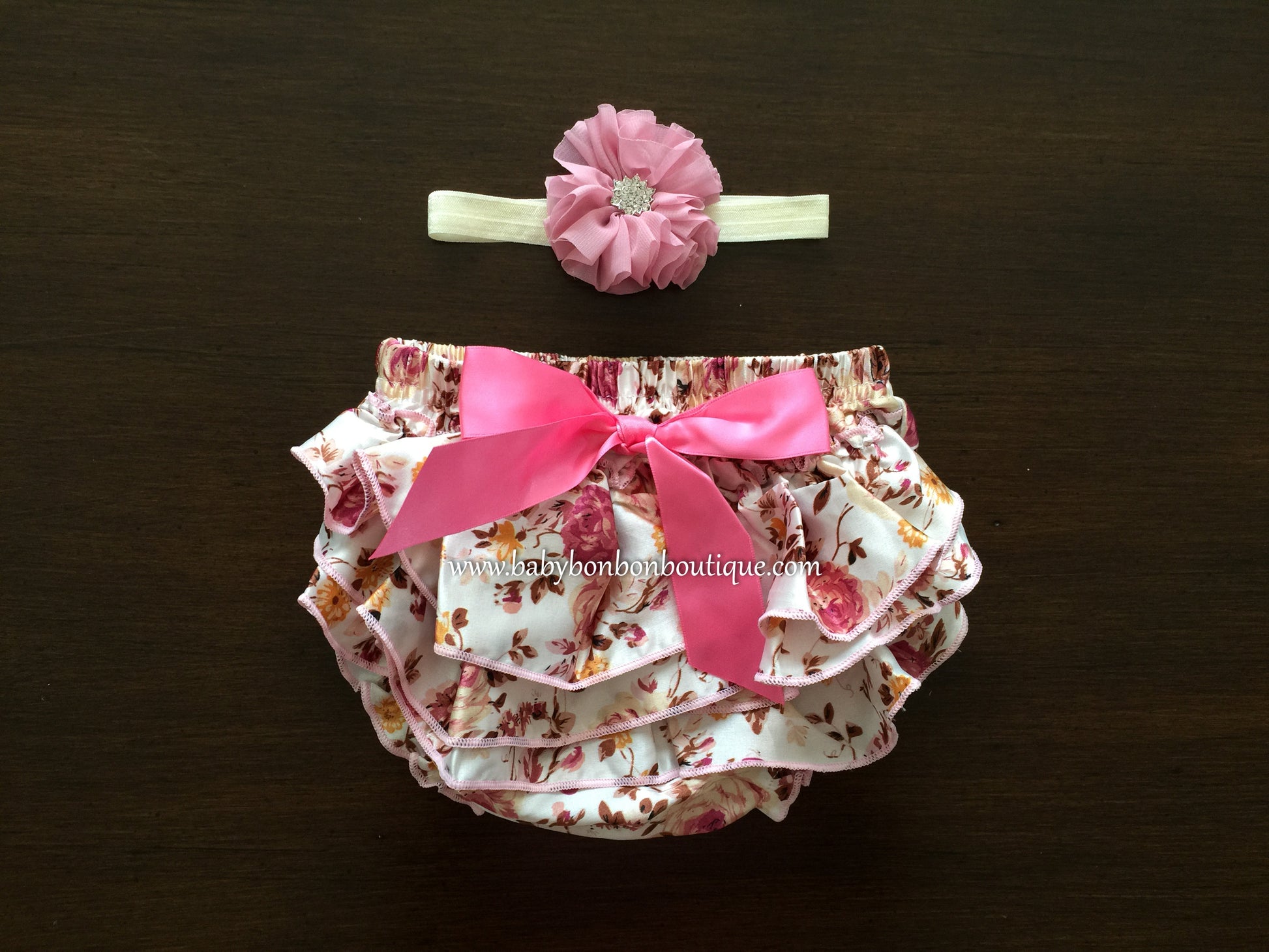 Fall in love with this beautiful baby girl French Floral Petti Ruffled Diaper Cover and matching flower headband. Part of the French Vintage Collection, these ruffled bloomers set is a must have! For your baby's comfort, it is made with soft fabric in your choice of French Baby Pink Floral or French Dusty Pink Floral satin. The elastic waist adds much comfort and flexibility. The back diaper ruffles are sweet and fluffy. This darling set is perfect for baby photos, baby birthday party, baby smash cake, baby holiday gift, baby sun suit, and more.